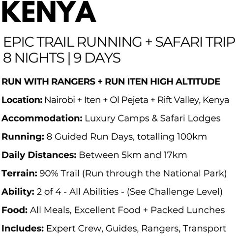 You’ll move at an inclusive, adaptable pace that suits all abilities, guided by experienced local runners and rangers, while learning about Kenya’s rich running culture and incredible natural heritage. Afternoons and evenings will be spent in carefully chosen luxury camps and lodges, where you can relax, share stories by the campfire, or enjoy the comfort of a hot shower and delicious local meals. Along the way, you’ll spot lions, elephants, rhinos, giraffes, and zebras - sometimes from the trails themselves - and experience the thrill of being fully immersed in Kenya’s extraordinary landscapes.